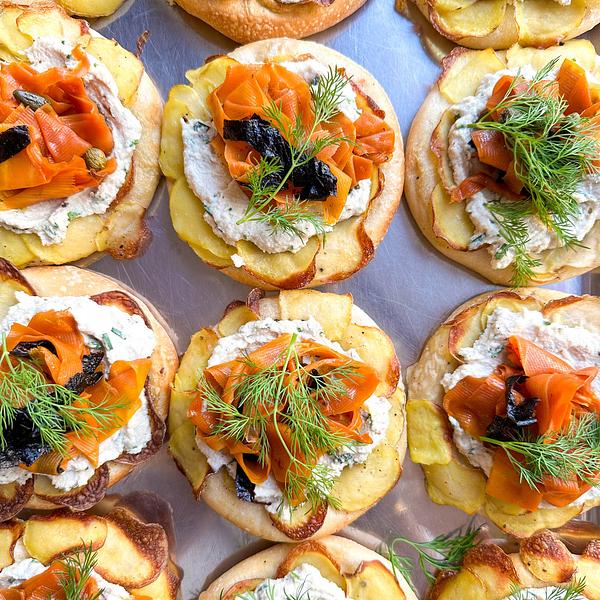 Bułeczka z twarożkiem słonecznikowym, wegańskim łososiem z marchewki, koperkiem i talarkami ziemniaczanymi. Box zawiera 5 sztuk.