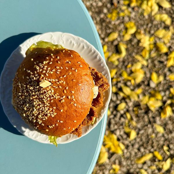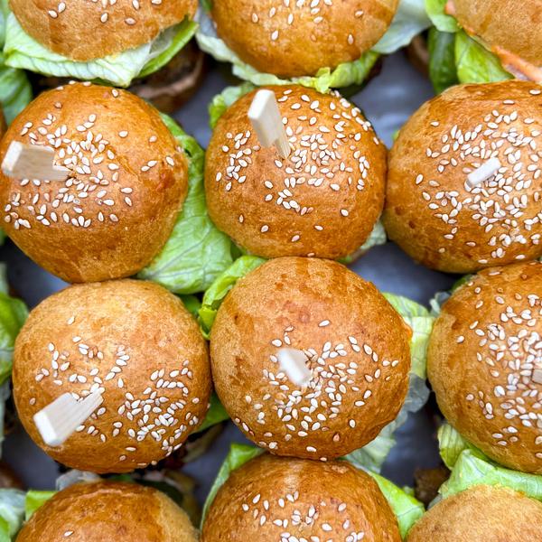 Brioche z panierowanym boczniakiem, korniszonami, sałatą i sosem tysiąca wysp. Box zawiera 5 sztuk.