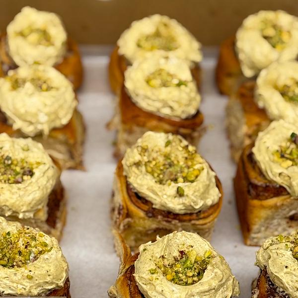 Drożdżówka wypełniona cynamonem, posmarowana od góry kremem pistacjowym. Box zawiera 5 szt.
