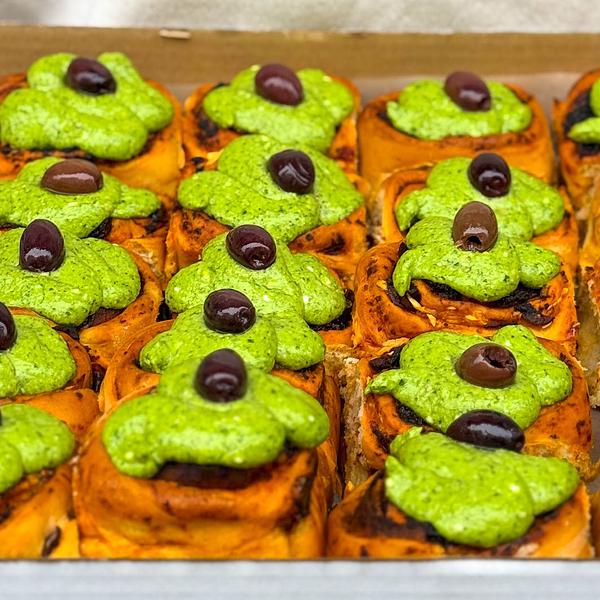 Rollsy drożdżowe z roślinnym pepperoni, oliwkami, sosem pomidorowym, roślinnym cheddarem i pesto pietruszkowym. Box zawiera 5 sztuk.