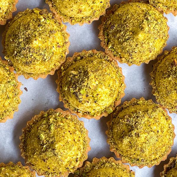 Krucha babeczka wypełniona kremem pistacjowym z dodatkiem konfitury pomarańczowej. Box zawiera 5 sztuk.