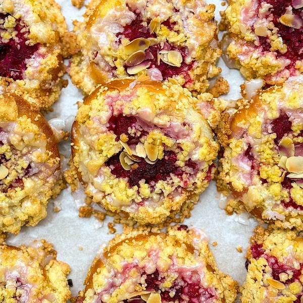 Drożdżówka z malinami, kremem waniliowym boston, kruszonką i migdałami. Box zawiera 5 szt.