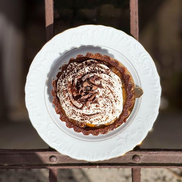 Kruche ciasto czekoladowe, kajmak, świeże banany i bita śmietana roślinna. Opcja bezglutenowa. Box zawiera 3 sztuki.