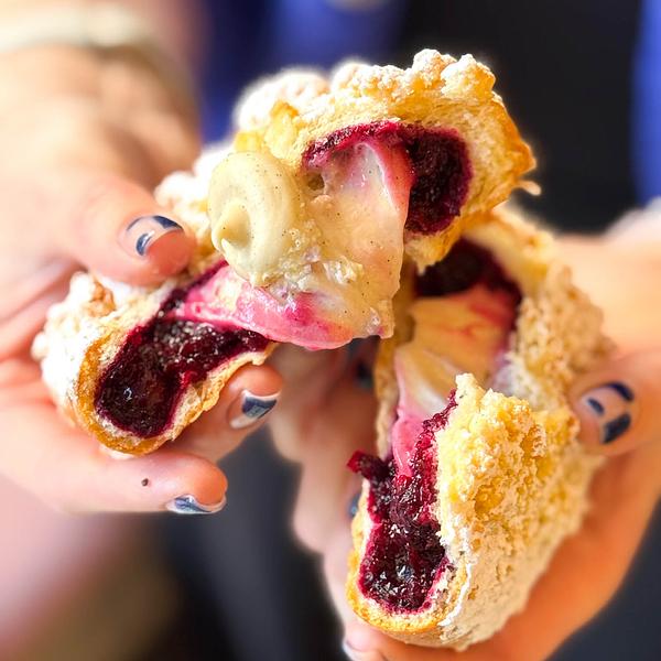 Drożdżówka z czarną porzeczką i kremem boston, obsypana kruszonką i cukrem pudrem. Box zawiera 5 sztuk. *Na zdjęciu poglądowa drożdżówka w regularnym rozmiarze.